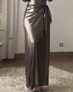 Aurora Skirt – an elegant piece crafted from luxurious metallic satin, featuring a wrap-effect design with a side tie that beautifully flatters the silhouette.