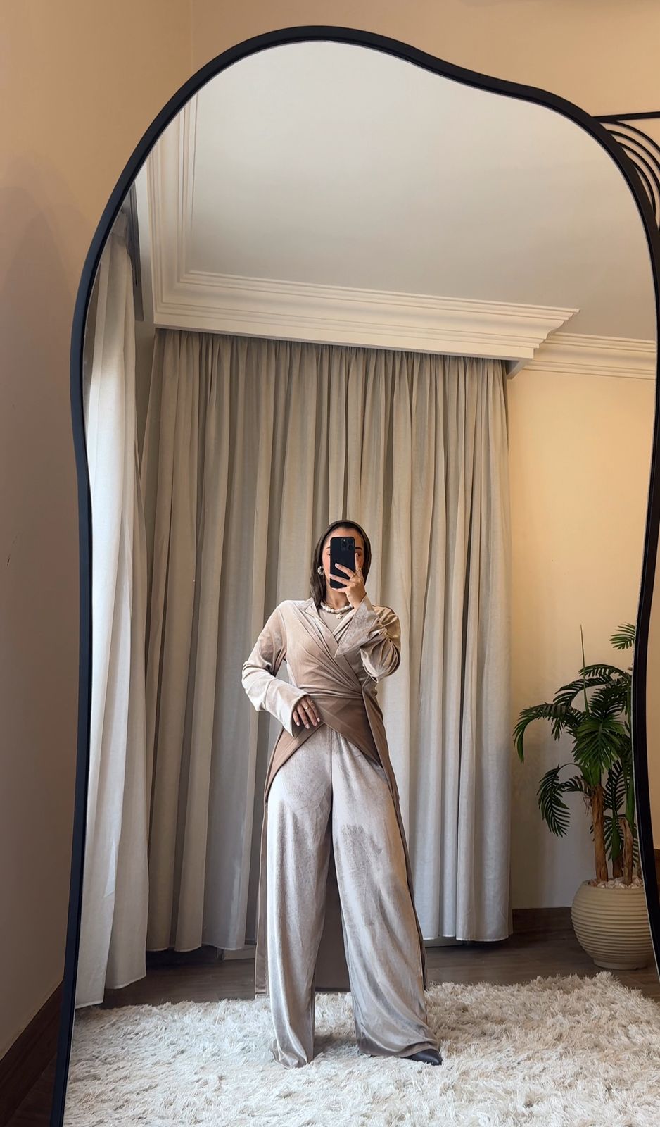 A refined two-piece velvet set designed for an elegant and modern modest look. The wrap-style blouse features a flattering crossover front with long sleeves, creating a soft silhouette that defines the waist gracefully. The wide-leg pants are crafted from the same luxurious velvet fabric, offering a smooth drape and effortless movement with a subtle sheen.