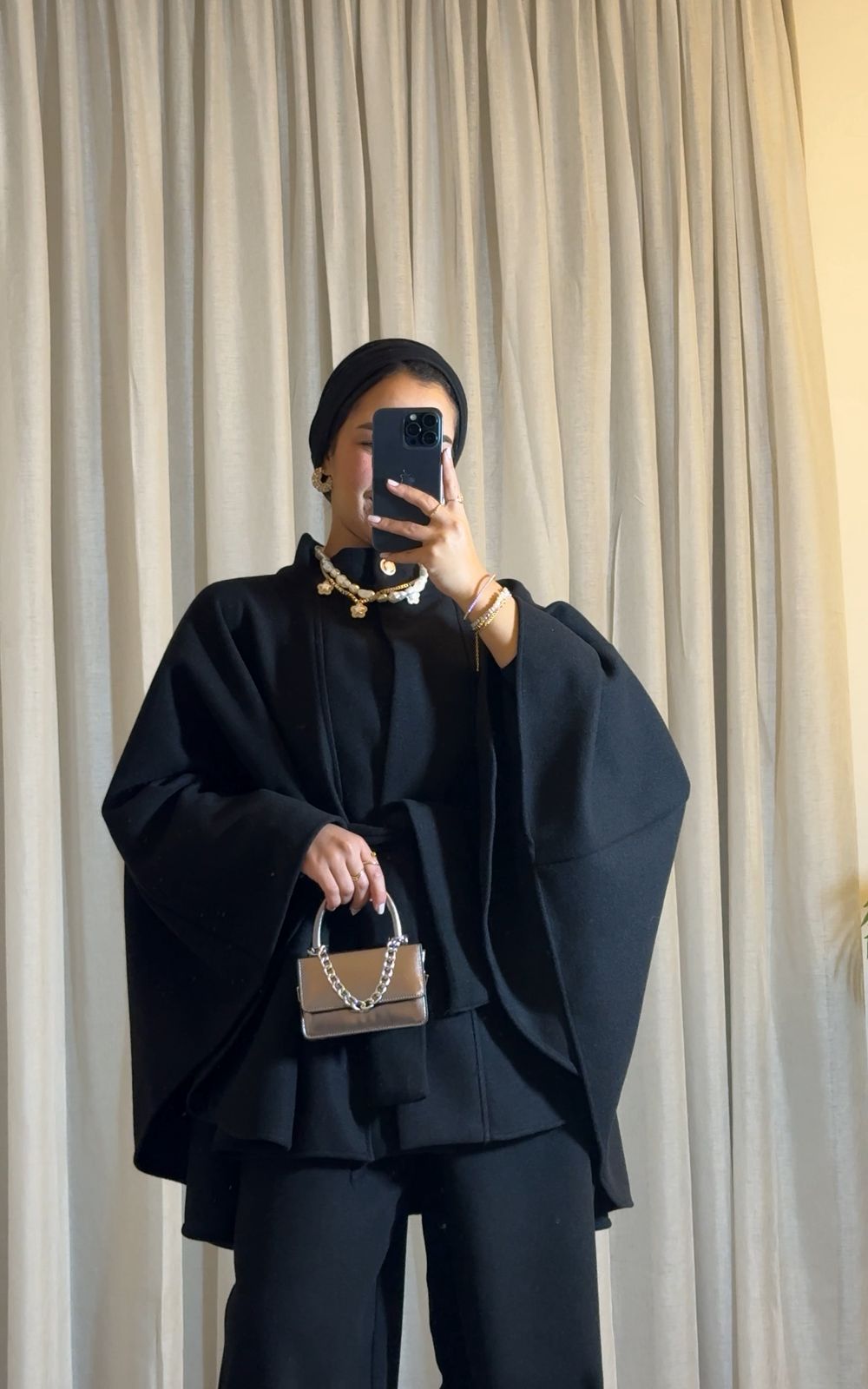 Inspired by butterfly wings, the cape features a wide, flowing silhouette that offers comfort and sophistication, finished with a waist belt for a flattering feminine shape.