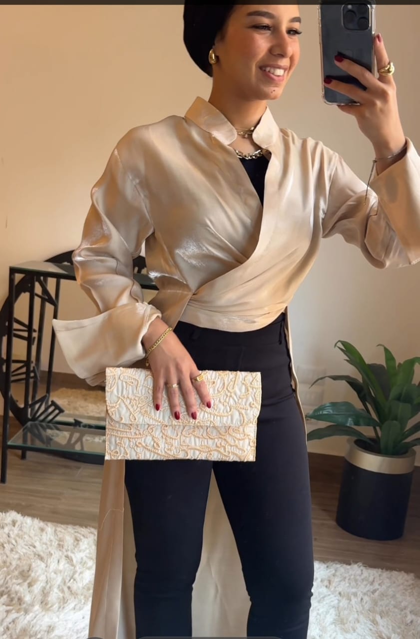 With its warm neutral tone and glossy finish, this set brings out your inner glow. The wrap-style blouse adds a sculpted feel, while the flowing pants give you freedom and poise.